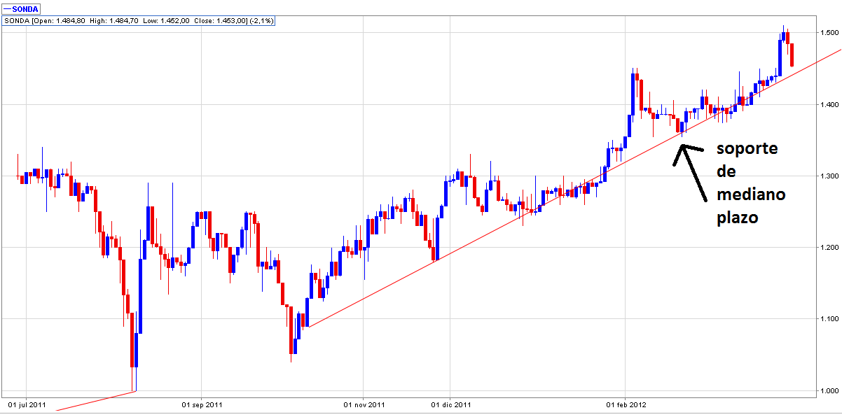 Y es así como me planteo la pregunta que puse hace un momento, si será que CENCOSUD vaya a dar más rédito que SONDA, que en mi estimado de corto plazo es rentar 10,76%, y mediano 16,92% (porcentajes calculados del parrafo 2). O que SONDA llegará en el corto plazo a cotizar (por lo menos) a $1.670, y en el mediano a $1762, igualando la rentabilidad estimada para CENCOSUD, usando su tendencia alcista sin resistencias anteriores.