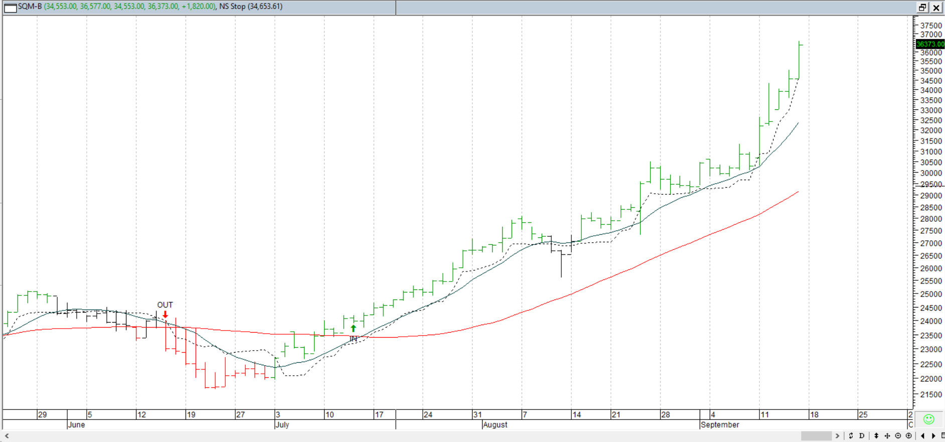 Ahora aplicamos la fórmula a SQM con sistema que dió entrada el día 14/07/2017 . Ese día ATR(13) era de 599 y redondeamos en 600. Es decir que los últimos 13 días SQM bajo o subió en un rango de +- 600