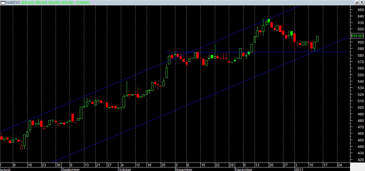 Que raras las lineas de tendencia , apoyadas en 2 puntos muestran un panorama más favorable de lo que es. En todo caso las lineas que trazas de de soporte y resistencia son las que deberían marcar la oscilación del precio del papel en un mercado como el actual que no se define para ningún lado, a pesar que tires una línea de tendencia apoyada en más puntos (esta ahi...)