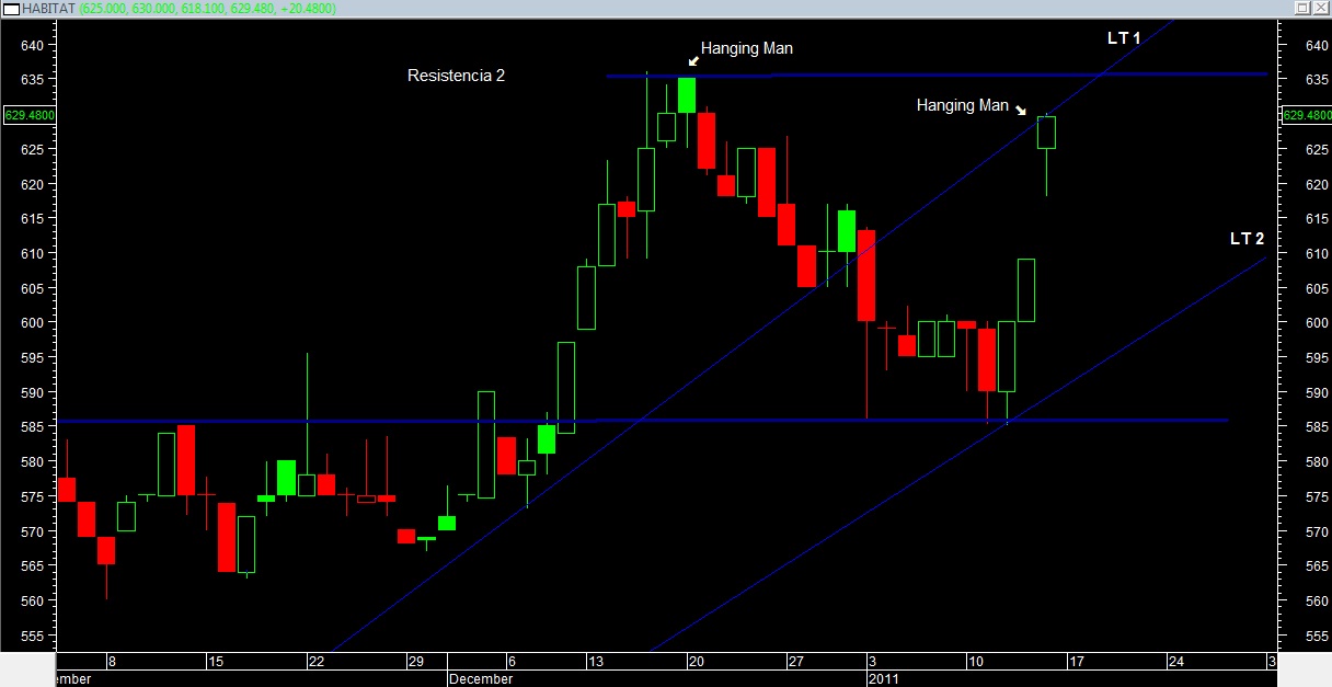 Viendo mas en detalle, podemos decir tambien que la vela del viernes es un hanging man (hombre colgado) lo que seria una antesala bajista (segun las velas japonesas) pero eso requiere confirmacion y la credibilidad es mediana, es decir, no son 100%confiables (puede que se de el alza tambien), algunas veces con respecto a las velas es lo mismo tirar los dados.