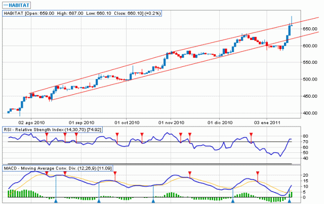 Habitat me parece actualmente un papel ordenado, generalmente entrega un porcentaje interesante con poca volatilidad por lo que siempre lo mantengo en mi portafolio cuando da señales de ingreso. En este caso se observa un rebote en la zona de los 585-590 hacia el alza, el momentum acaba de romper hacia el alza el cero, su fuerza va en aumento y cerro sobre sus 3 medias moviles despues de estar por mas de dos semanas bajo estas.