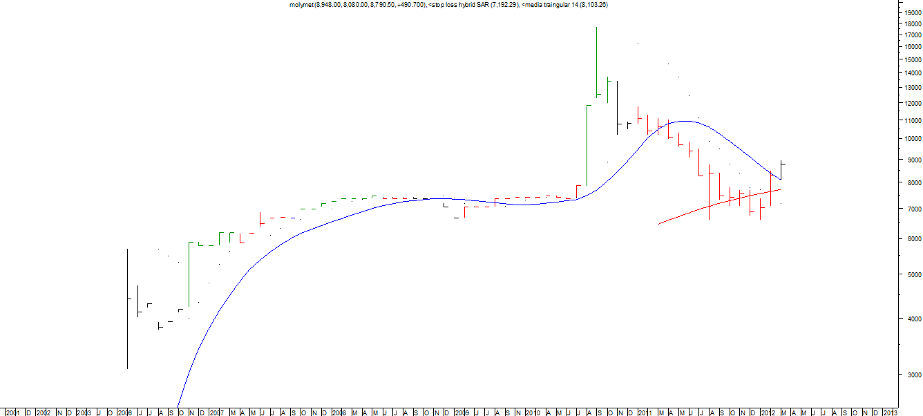 Creo que el alza se debe a que China dijo que limitará sus exportacions de metales raros y Obama dijo que demandará a China por esa cláusula. Un análisis A vuelo de pajáro:  Menor oferta de metales raros = escases = alzas en precio = mejores ventas y utilidades PARA MOLYMET. Ojo, moly rompe los 8500 que fueron techo sicológico.... muy bullish se ve