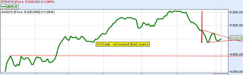 GASCO está sobre su valor promedio y la tendencia es hacia abajo. Yo no me metería. Esa subida desabrida que tuvo hace poco la he visto antes y no lleva a ninguna parte...