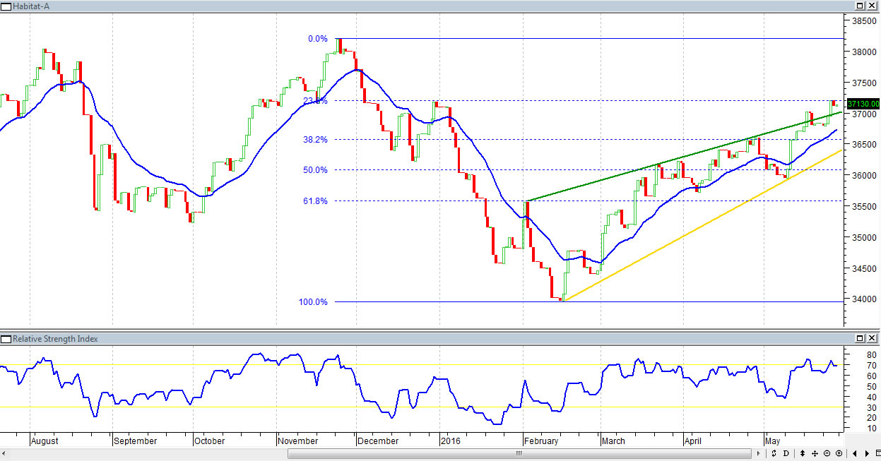 estimados por acá dejo gráfico del fondo A de habitat con la proyección de los últimos dias, es clara la tendencia al alza de los precios desde marzo 2016, el rsi en niveles de sobrecompra, sobre la media movil azul de 25 periódos y rompiendo el techo verde del canal alcista.. esto hasta ahora ... no sé los master que opinan yo ya solicite cambio de un % al E creo que es buen momento para tomar ganancias