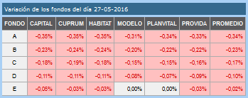 Variación AFPs 27.05.2016 en todos sus Fondos.