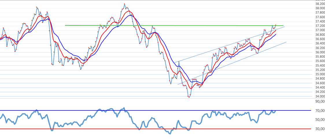 Se pueden ver medias móviles exponenciales al alza, saliendo del canal y pareciera ya está rompiendo resistencia, pero con RSI en niveles de sobre compra.