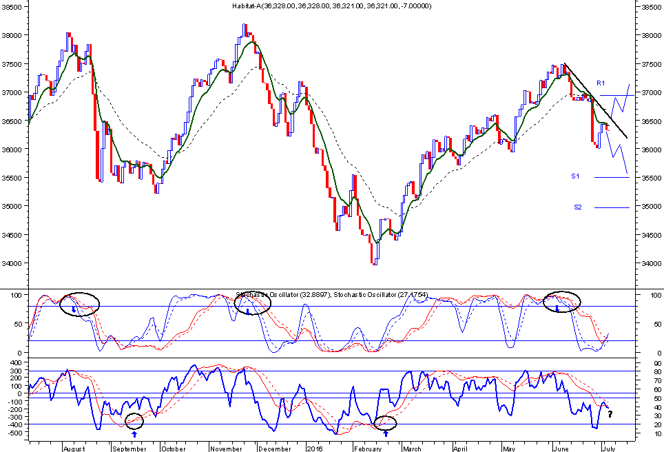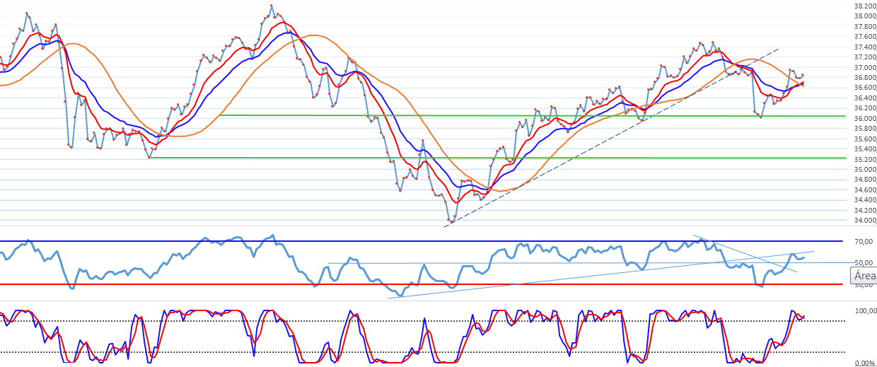 Veo que al precio le costó cruzar la MM9 en esta caída (y probó varias veces), podría repetirse el patrón aumentando probabilidades de que toque a la LT alcista que está justo por debajo (35770 aprox) y que coincide con fibo