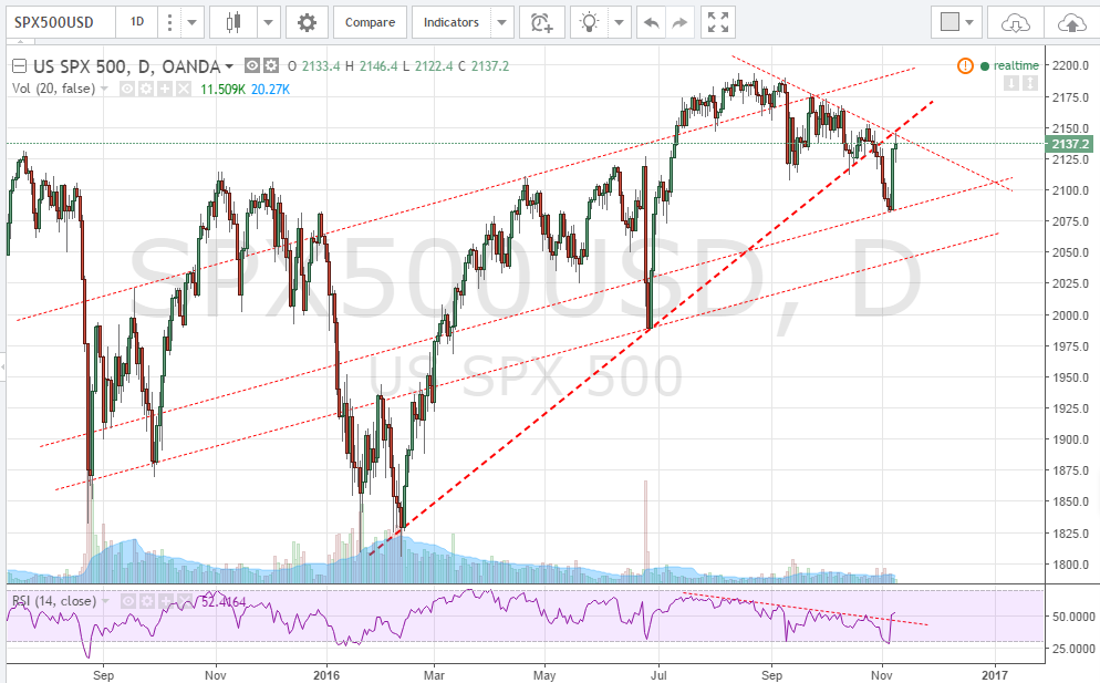 Abstrayéndose de las elecciones, el gráfico diario muestra la posibilidad que esto sea un pullback despues que hace poco rompió la tendencia al alza, posterior a este pullback que podría llegar estimo en un 1% más, debería caer inexorablemente. ahora bien.... respecto de los 2 escenarios vistos antes...el análisis técnico coincide más con un triunfo de hillary, lo cuál a esta altura es lo más probable.
