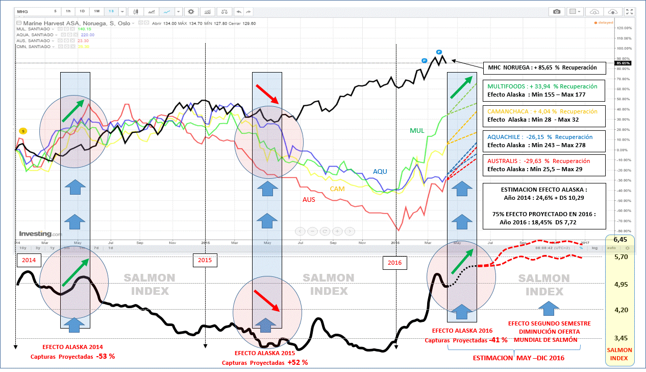 Es una PROYECCIÓN de lo que podría acontecer según estimación entregada a principios de Abril por parte de la ADF&G (Alask Departament of Fish & Game) de una captura de -41%, esta estimación PODRÍA generar un alza anticipada del precio del salmón aumentando la presión que ya existe por las bajas en la oferta de salmón chileno sumado a los problemas que está provocando en Caligus o pijo de mar en algunos centros de Noruega (la resistencia que ha adquirido es alto y el verano que se aproxima en Europa podría agravar el problema ) , la BAJA proyección de capturas podría generar (al igual que el año 2014) una nueva alza en los precios del salmón gatillando aumento interesante en el valor de las acciones.El porcentaje de esta estimación de capturas del 2016 corresponde a un 75% aprox. respecto del año 2014, si ajustamos el impacto que esta noticia podría generar podríamos ver nuevos ajustes en las acciones de las salmoneras equivalente a un aumento de un 18,45% DS7,72, en la tercera columna se aprecian lineas entrecortadas que más abajo se detallan con números :