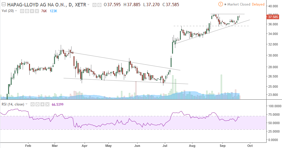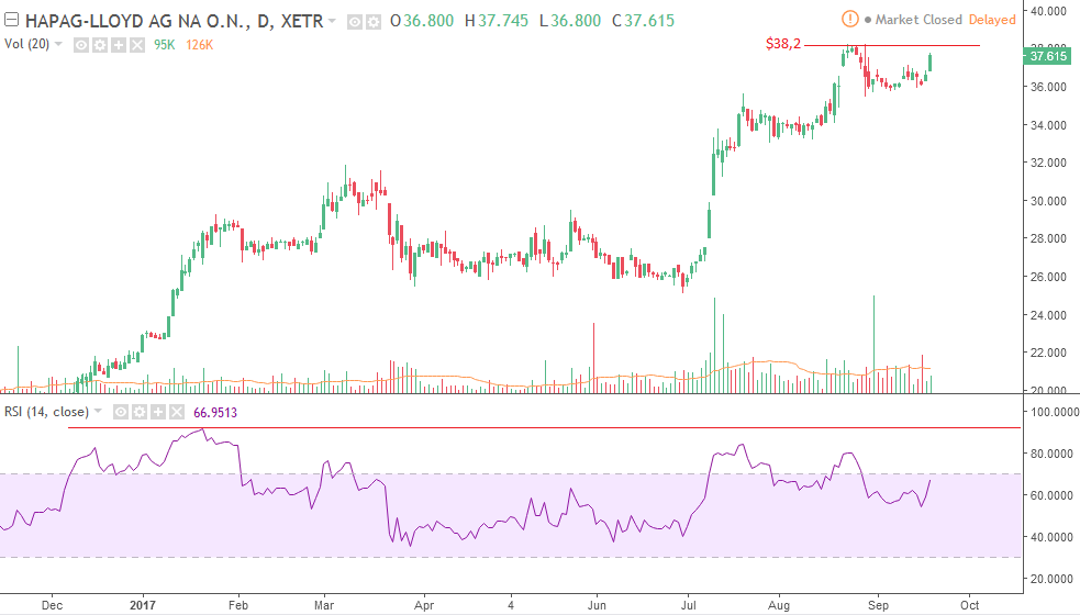 Zahkul escribió:Buena sesión de HLAG, vela de gran cuerpo verde que destaca respecto a los últimos 15 días. Quedó a tan solo 1,5% de su máximo histórico de EUR $38,18.- Veremos si va con inercia para buscar un nuevo máximo mañana, y a su vez arrastrar a Vapores.