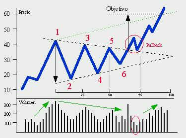 El precio baja, marca un mínimo relativo con esa baja, luego sube, pero no hasta los máximos anteriores...ahí se va armando un triangulo. La caída se marca con una paralela y los máximos con una diagonal a la baja...por eso se construye lento...hay mínimos y máximos en la figura, por lo que requiere varios impulsos.