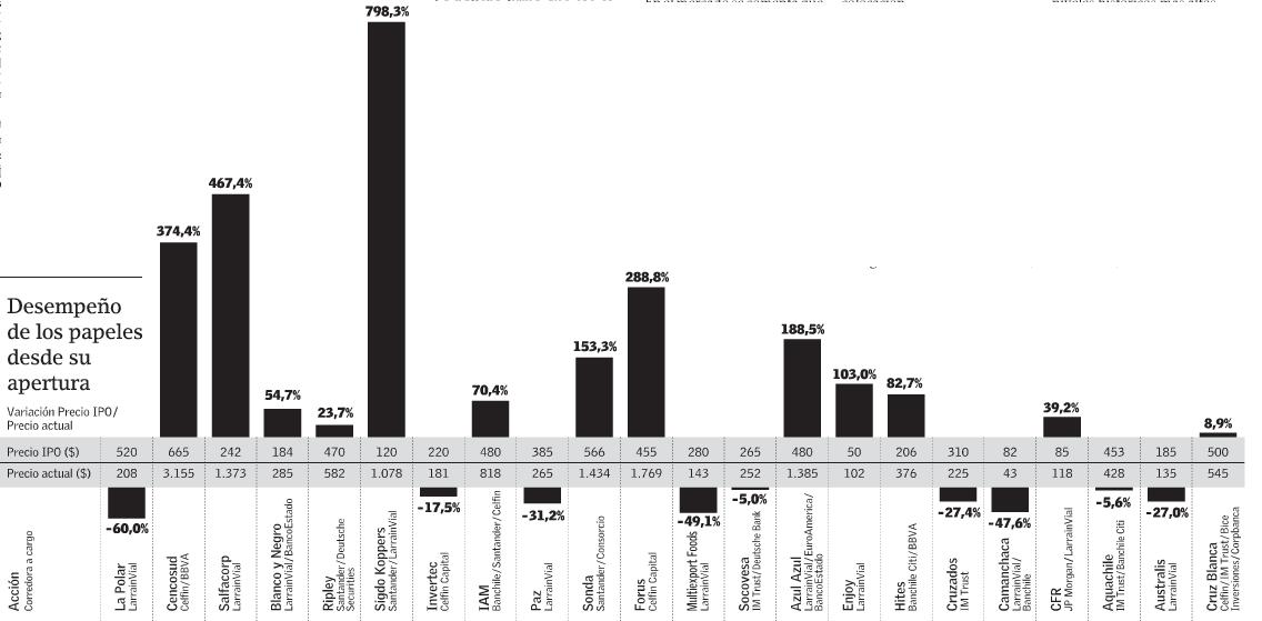 A proposito de apertura de bolsas. Si alguien no ha visto esto se los dejo ( el mercurio ) En resumen el 41% de las aperturas esta bajo el precio de colocacion. Hay unas que brillan y otras que estan en el sotano. Los salmones la gran mayoria bajo el apertura, Sk , cenco y la del derrumbe de hoy salfacorp muy bien.