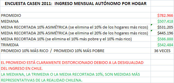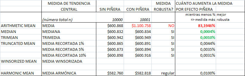 mediana =MEDIAN(rango datos) o media recortada al 10% =TRIMMEAN(rango datos;10%)Siguiendo con el ejemplo inicial de los 10000 + Piñera, está tabla (hecha vía simulación) te puede aclarar la idea: