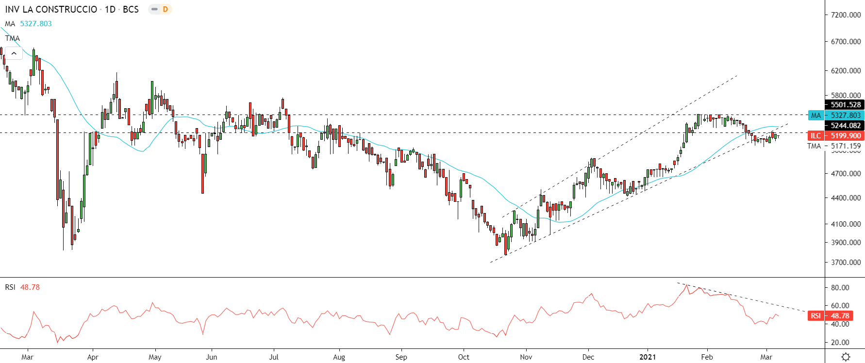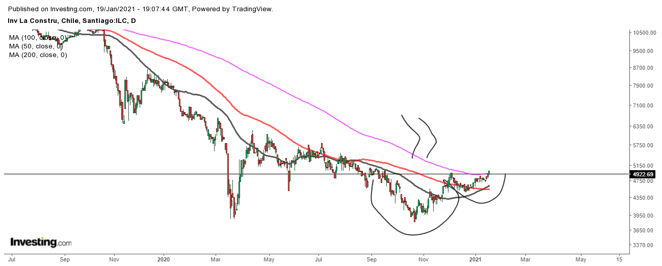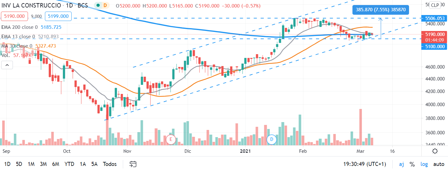 Ingresé a esta acción a 5255.2 el viernes 22-01. La veo muy ordenada sobre sus medias de 20 y 50. Me recuerda a la última partida de Vapores. En semanal se ve perfecta.