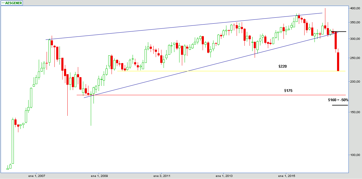 En 220 (en semanal) hay anteriores soportes...pero la caída tiene una pendiente fuerte, parece que no hay apuro por aquí (cazar el rebote tiene un riesgo alto asociado).