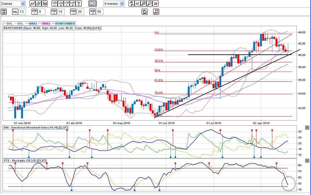 Revisé el papel y se ve cayendo desde varias sesiones, revisé las SMA 15, 30, y 45, y sólo está sobre ésta última (las dos primeras ya fueron rotas).... volumen normal.... STS no ha cambiado su señal de salida... no hay divergencia positiva con el MACD... banda del 23.6% Fibonacci rota también...etc...
