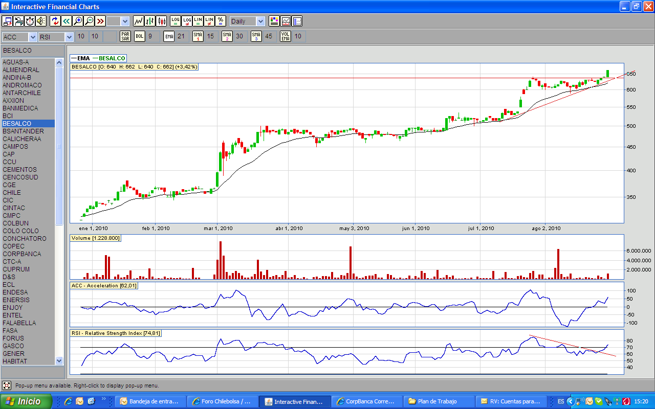Obs.: Acción rebotando en la mañana, mercado gral. al alza, volumen interesante, me las juego porque ahora sí que se afirme. Aumentando la posición con más fuerza. Puse esta y otras OC cerca de las 10 am, se compraron y me tuve que ir, hasta ahora no había visto... wena!... vamos que el lunes la cosa ojalá que siga...