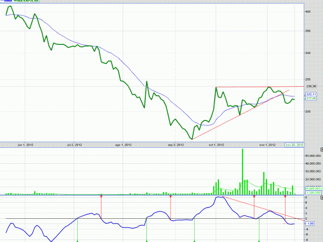 3.- En algunos casos el oscilador MACD permite clarificar cual es el futuro de Nuevapolar y el oscilador lamentablemente presenta una divergencia negativa, signo de que la fuerza del movimiento anterior se esta agotando.