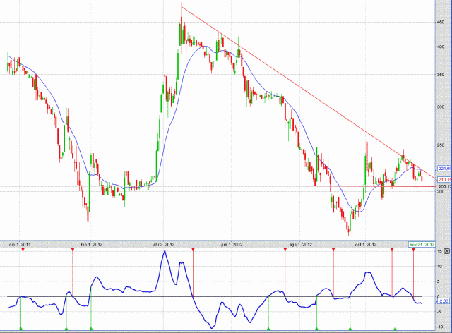 El volumen es un elemento mas a considerar en una tendencia al alza, porque le da mayor base al movimiento. En algunos casos en las tendencias a la baja el precio cae "por su propio peso", sin volumen relevante. Lo de los $ 205 no lo tengo claro...puede ser que mañana rebote a los $ 217- $220 y se genere un canal lateral entre los $ 207- $ 210 y los $ 220; puede que siga bajando no se puede saber, por ahora la única conclusión válida para mi es que ,según mi sistema, hay que estar out hasta que clarifique hasta cuando dura la corrección.