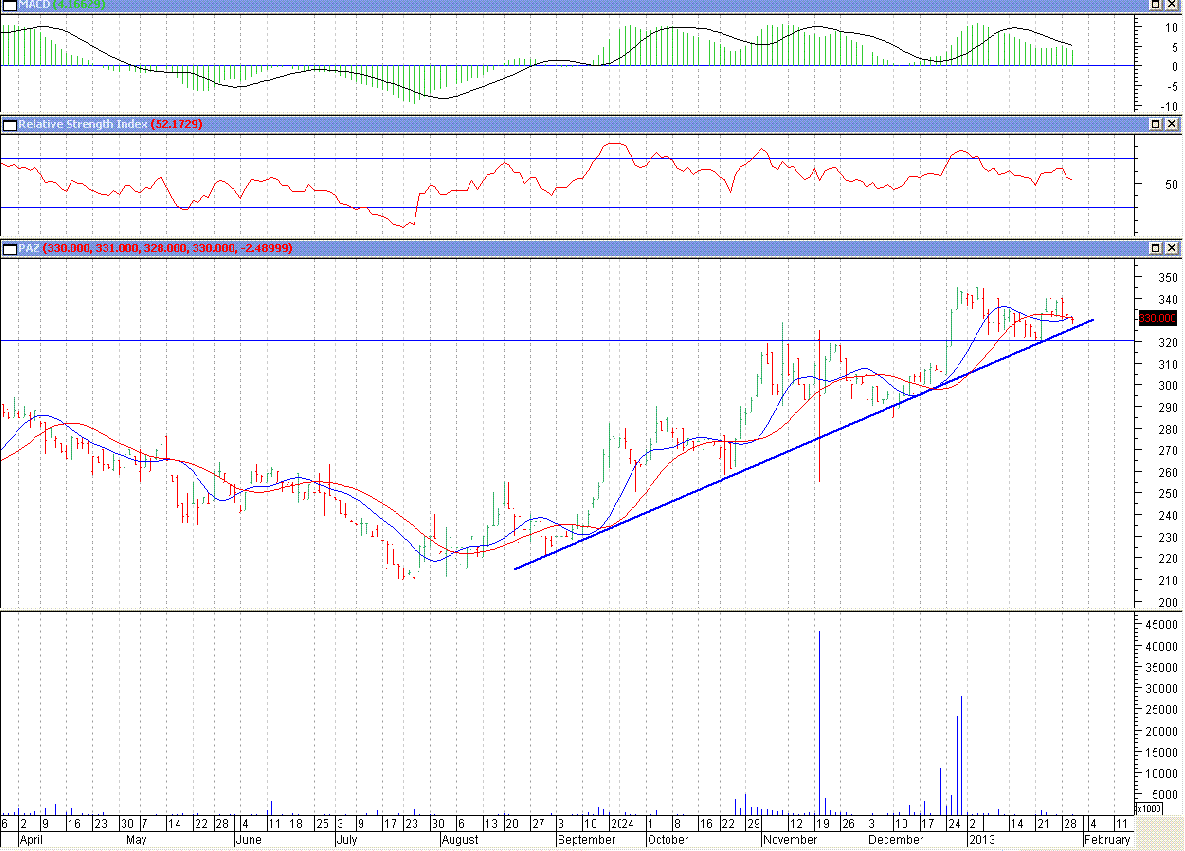 Los compradores tampoco quieren el papel, por eso ayer se formo un doji star, hay indecisión en el papel, lo complejo es que sigue estancado mientras otros dan bastante. Salfa, Besalco, hasta Soco tiene mejor aspecto......mientras no vuelva el volumen seguira su paso a la baja hasta toparse con la media móvil y la línea de tendencia, de pasar los $327- $ 325 mañana tendríamos a un elefante muerto creo yo.