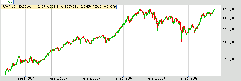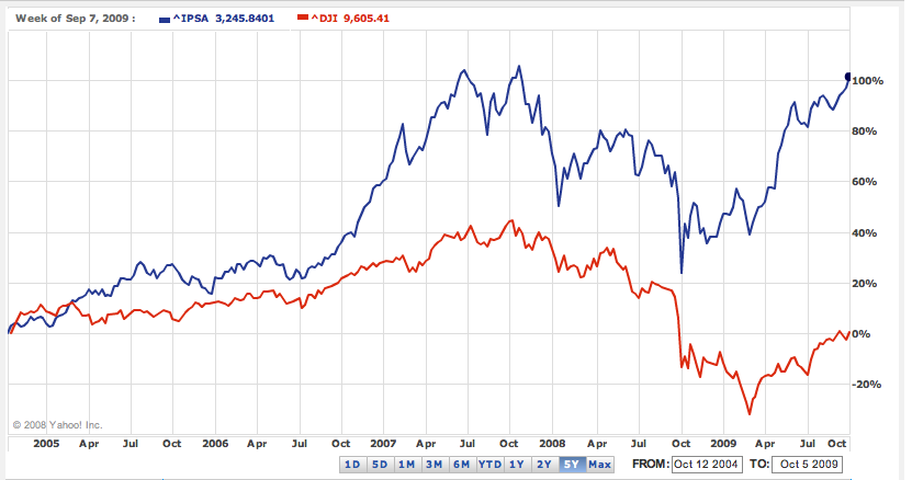 El 10 de octubre se cumple un año desde que la bolsa chilena tocó fondo en esta llamada crisis sub-prime, al tocar el IPSA los 2.017 puntos (cerrando ese día en 2.101) perdiendo todo lo ganado los años 2006 y 2007, a partir de esa fecha, nuestra Bolsa comenzó a despegarse de la Bolsa norteamericana comenzando una rápida recuperación que hasta el momento ha tenido forma de V y que en un año le ha permitido recuperarse hasta llegar hoy a niveles de 3.456,7, muy cerca de los cierre máximos históricos de 3.499 en julio del 2007 y de 3.496 alcanzado en octubre del 2007, acumulando un alza de casi 65% en 12 meses.