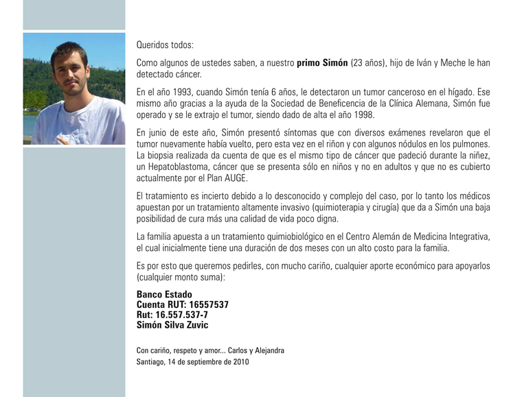Así que el que pueda colaborar por favor hacer los depositos a la cuenta corriente nro. 63-42096-4 del Banco Santander a nombre de Simón Silva Rut 16.557.537-7, el mail de mi tio es [email protected].